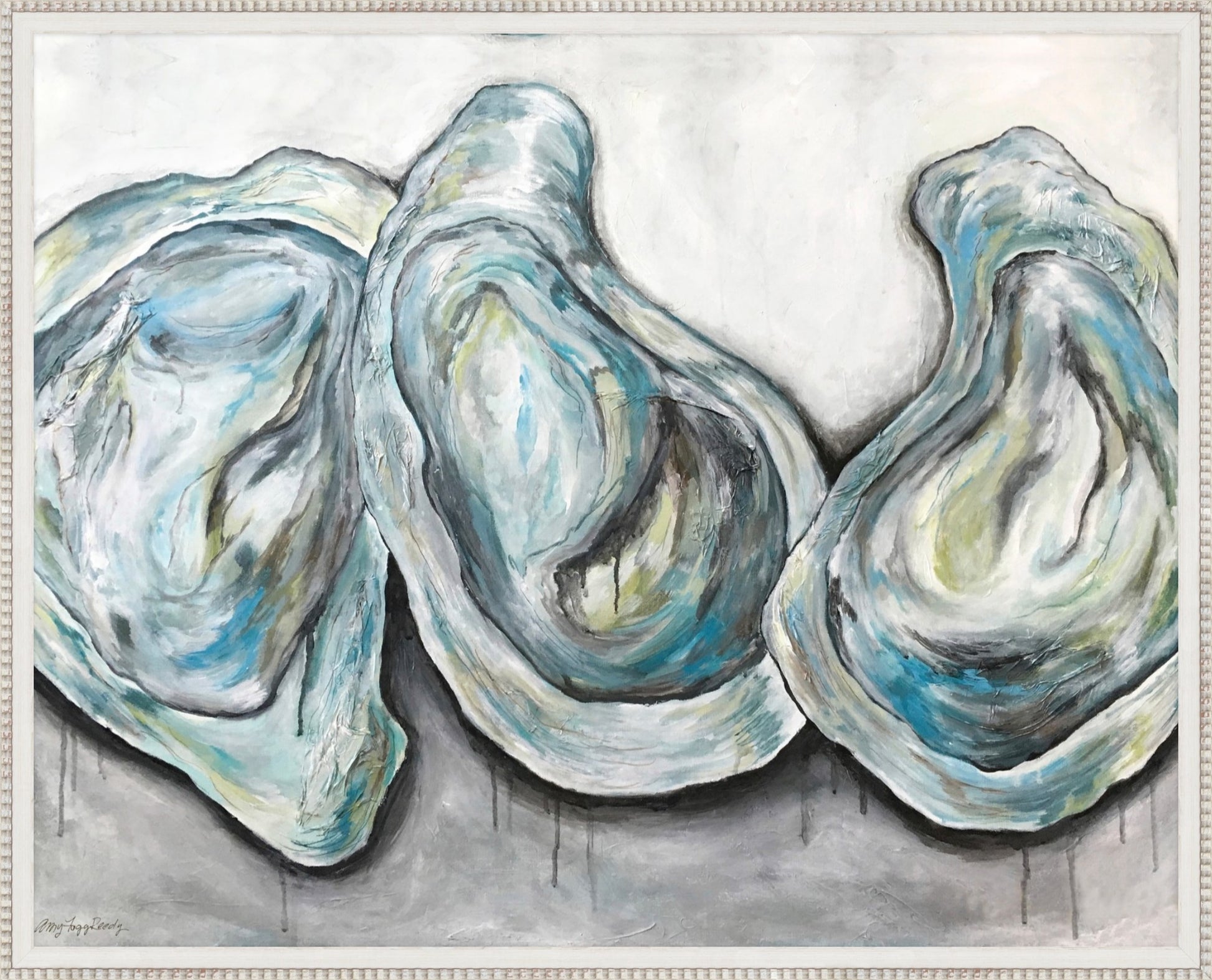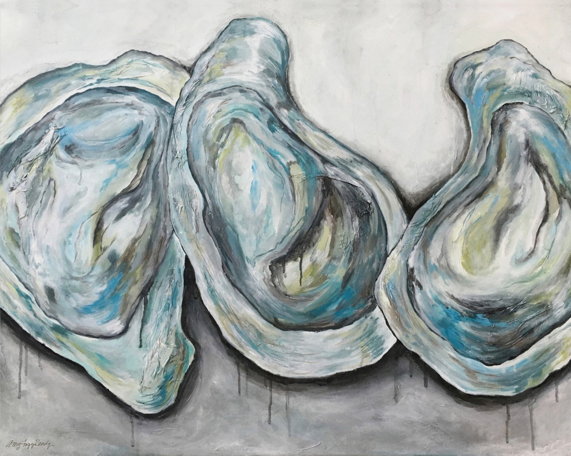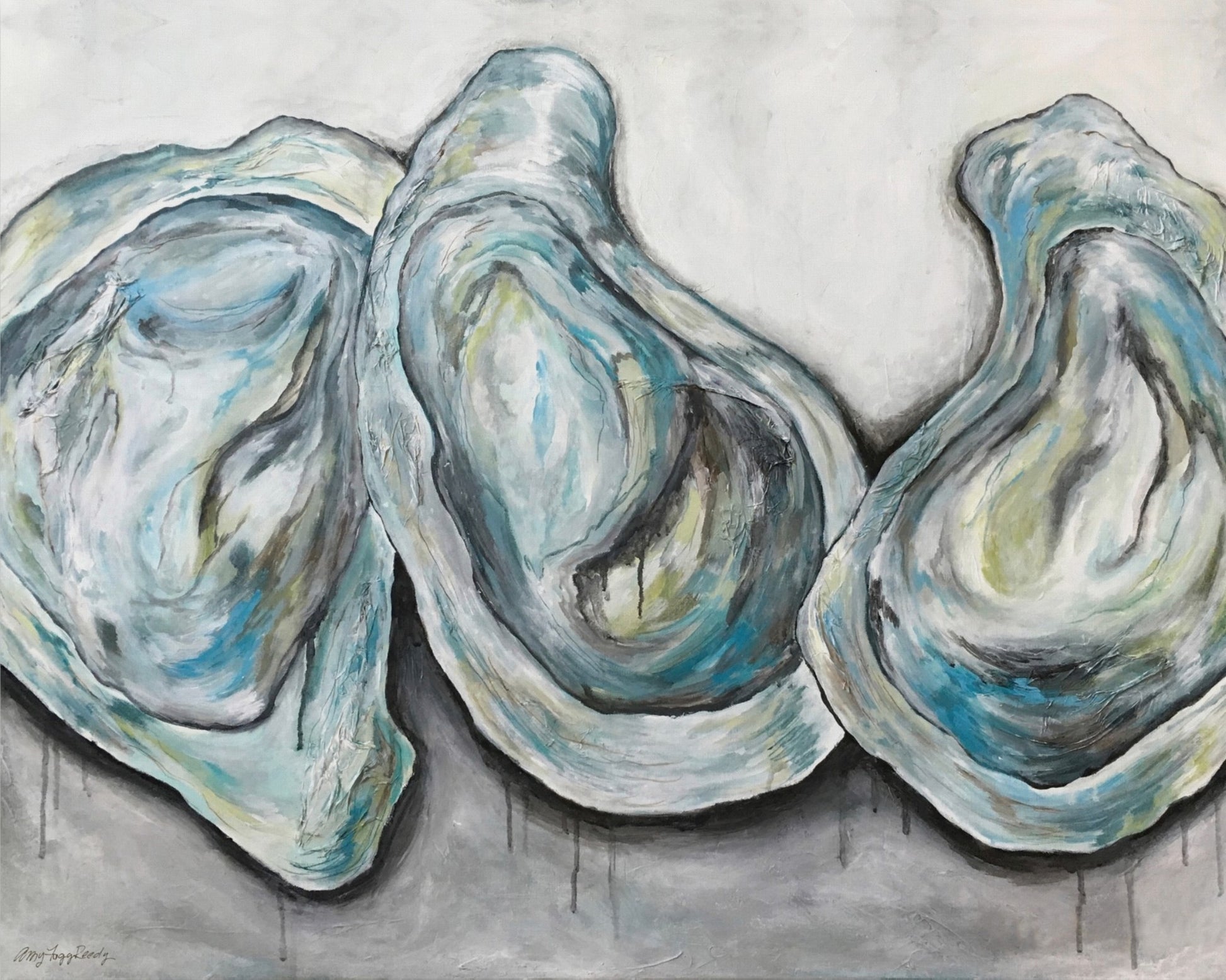 When Amy Fogg Reedy's family of four became three, she found an unexpected metaphor in the oyster—a creature that transforms challenge into something luminous. This trio represents Amy and her two children moving forward together through change.