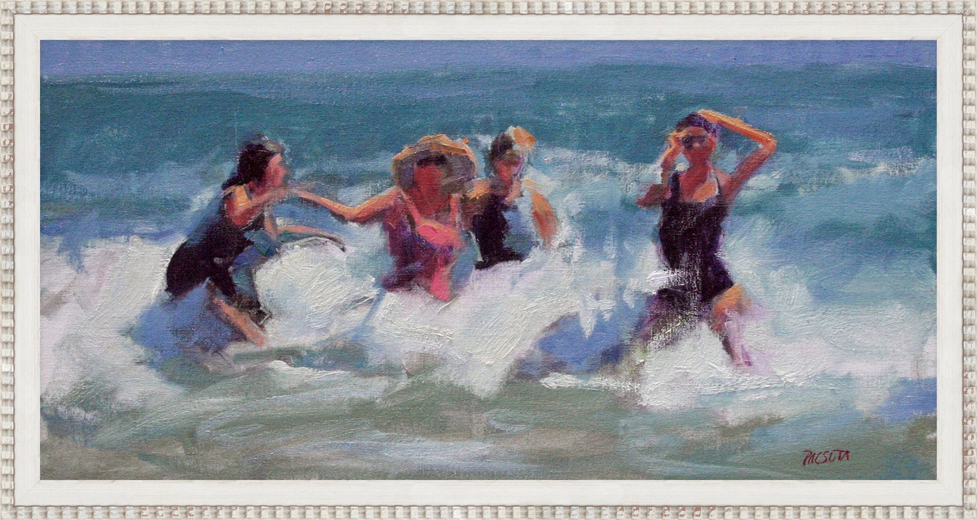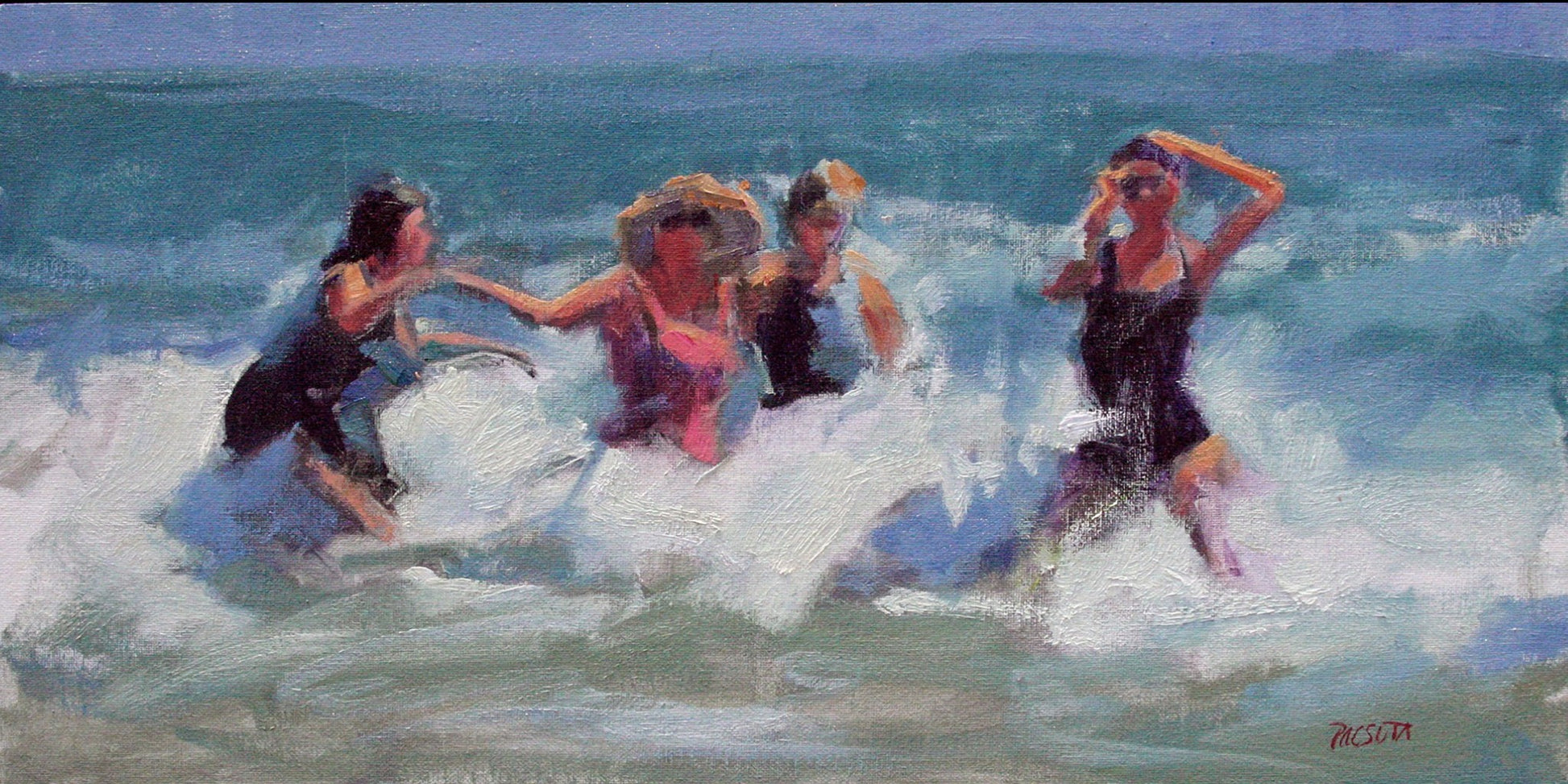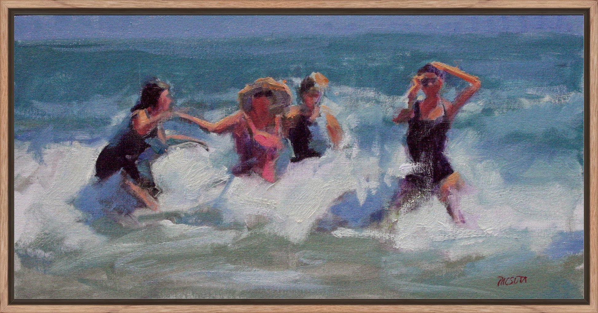 Four friends, waist-deep in the surf, jumping and splashing through the waves—pure joy captured in thick, energetic brushstrokes.Y ou can almost hear the laughter and feel that moment when a wave hits and everyone screams.