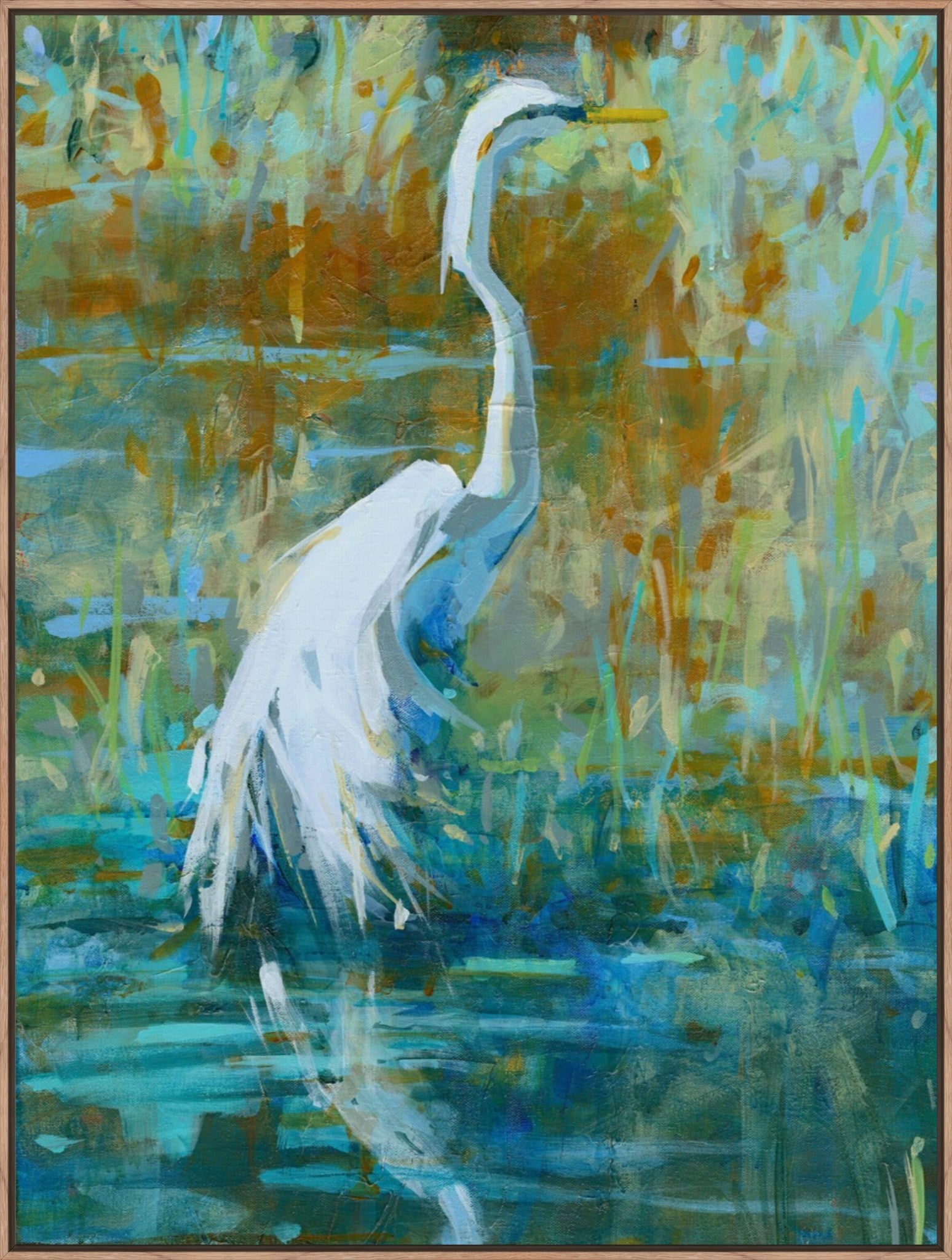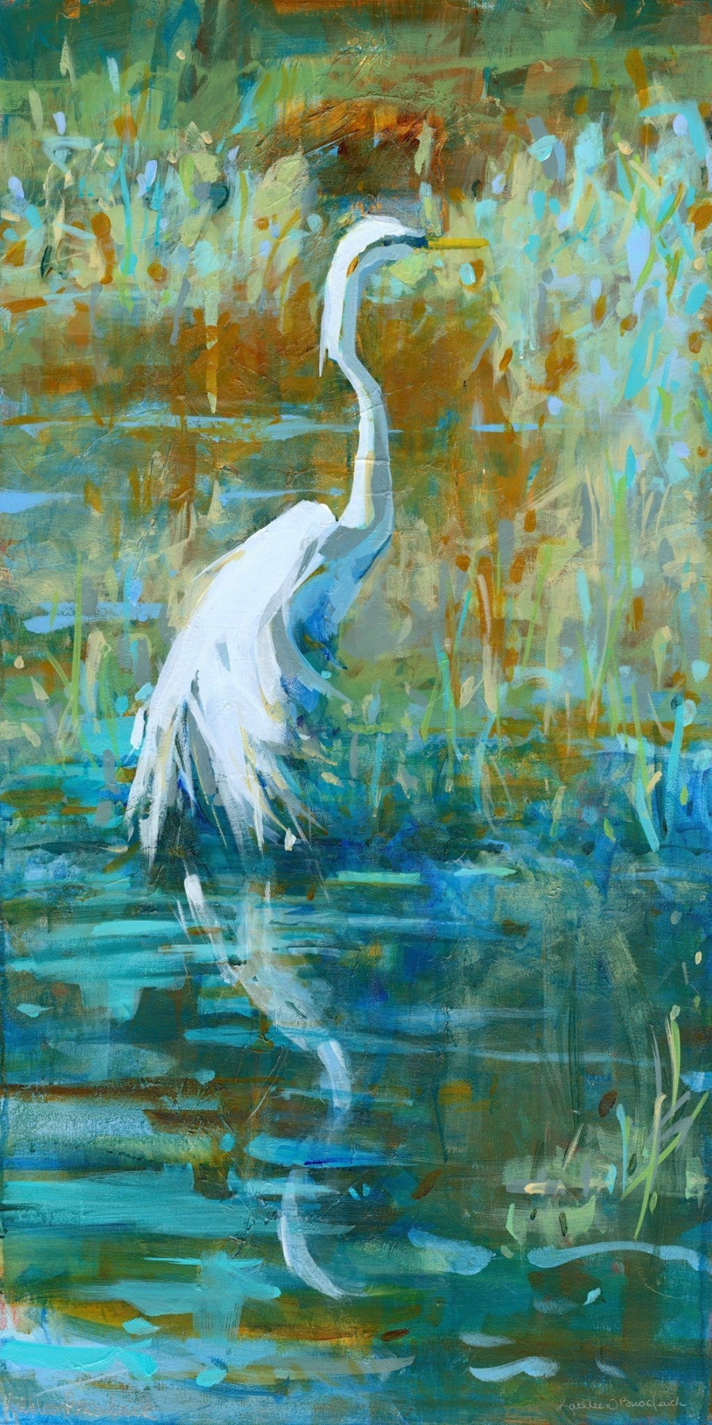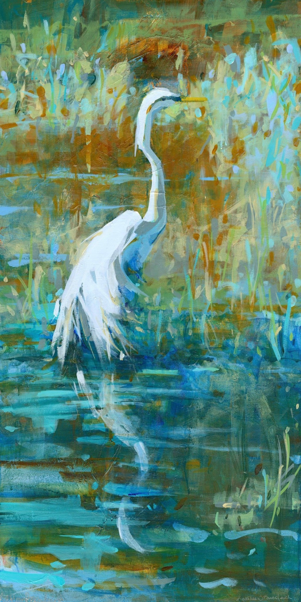 "Ombre" captures the vivid interplay of blues and oranges, lake energy and heron stillness—a study in coastal contrasts.