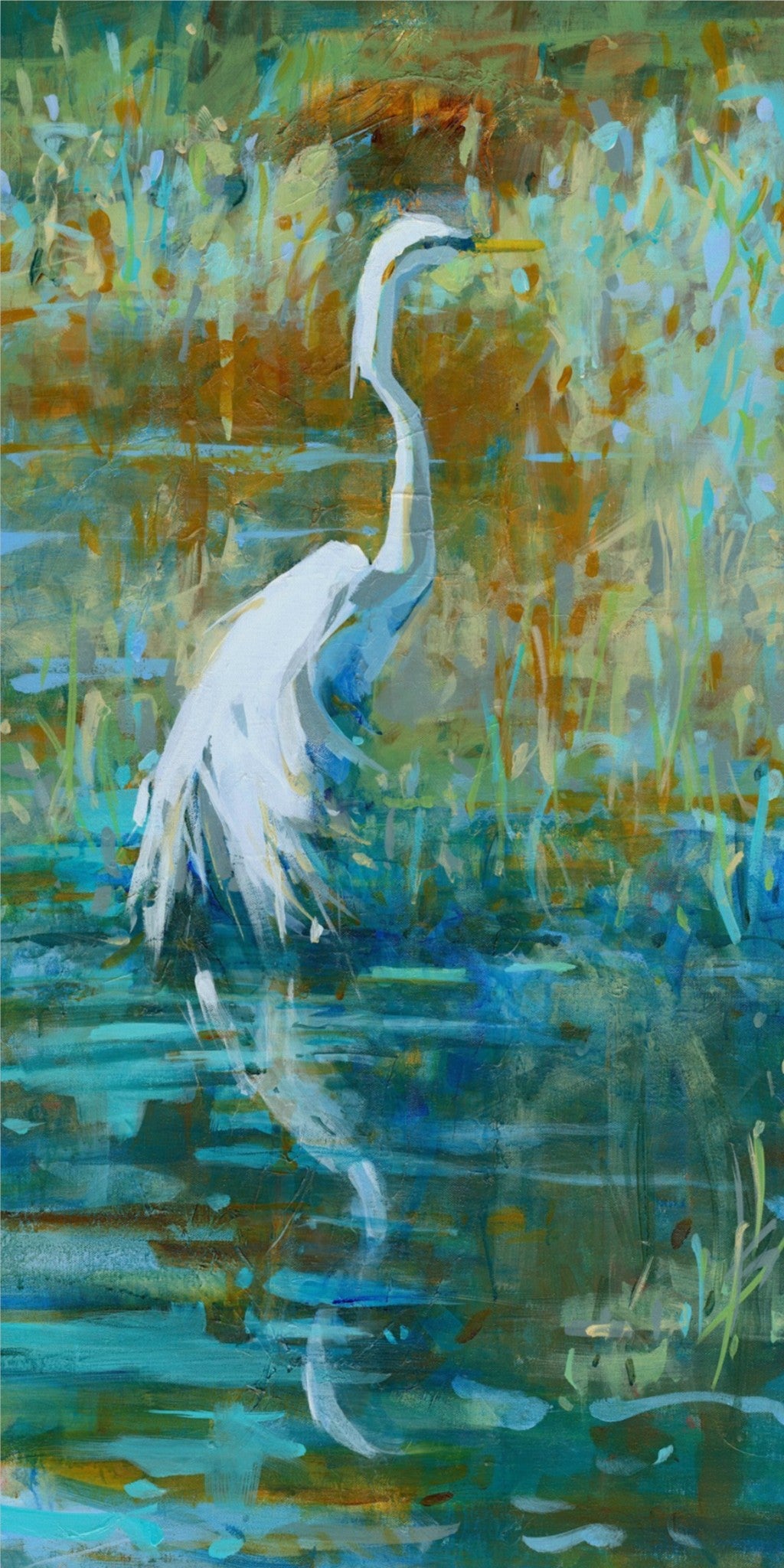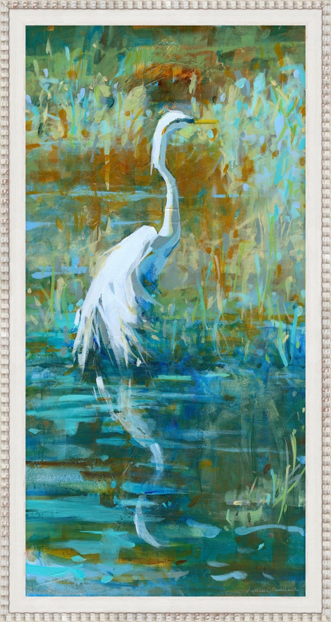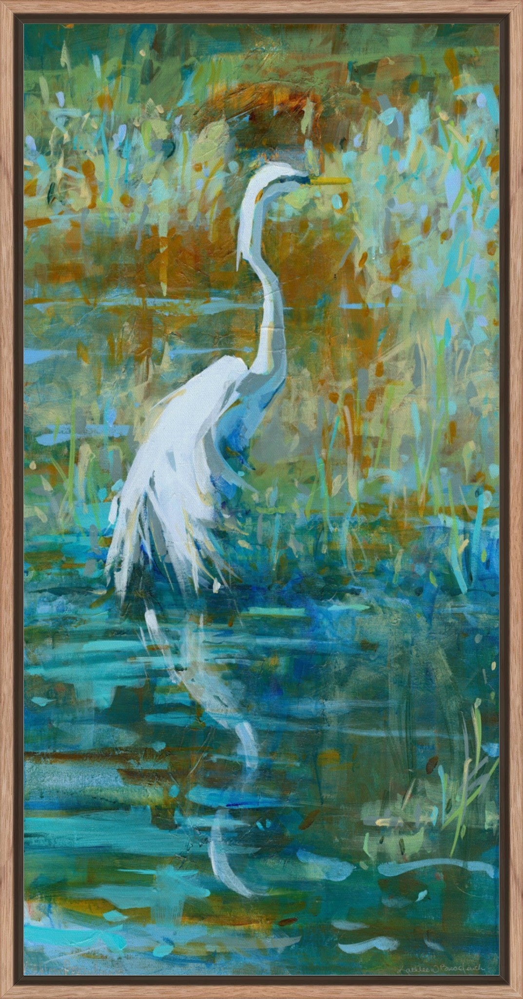 "Ombre" captures the vivid interplay of blues and oranges, lake energy and heron stillness—a study in coastal contrasts.
